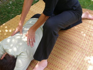Le Shiatsu (terme japonais signifiant pression des doigts) est une discipline manuelle de régulation des énergies et de détente, pratiquée depuis des millénaires en Extrême Orient, consiste en des étirements et des pressions sur l’ensemble du corps, plus particulièrement les pouces et les paumes.Le receveur est habillé, allongé sur un futon.